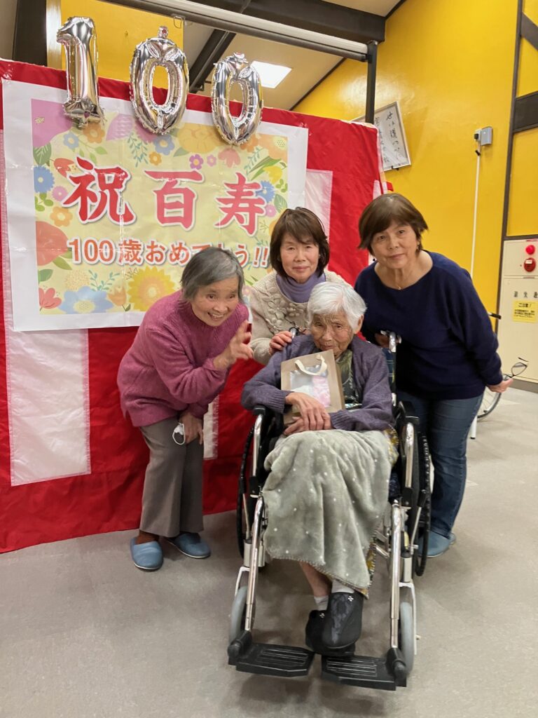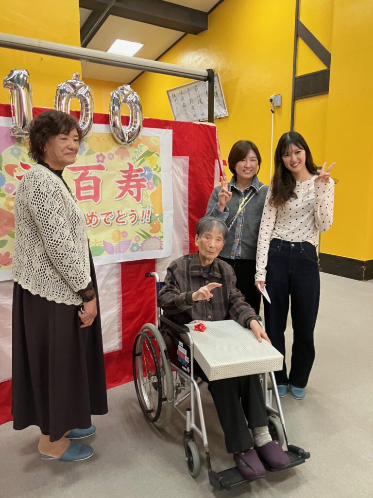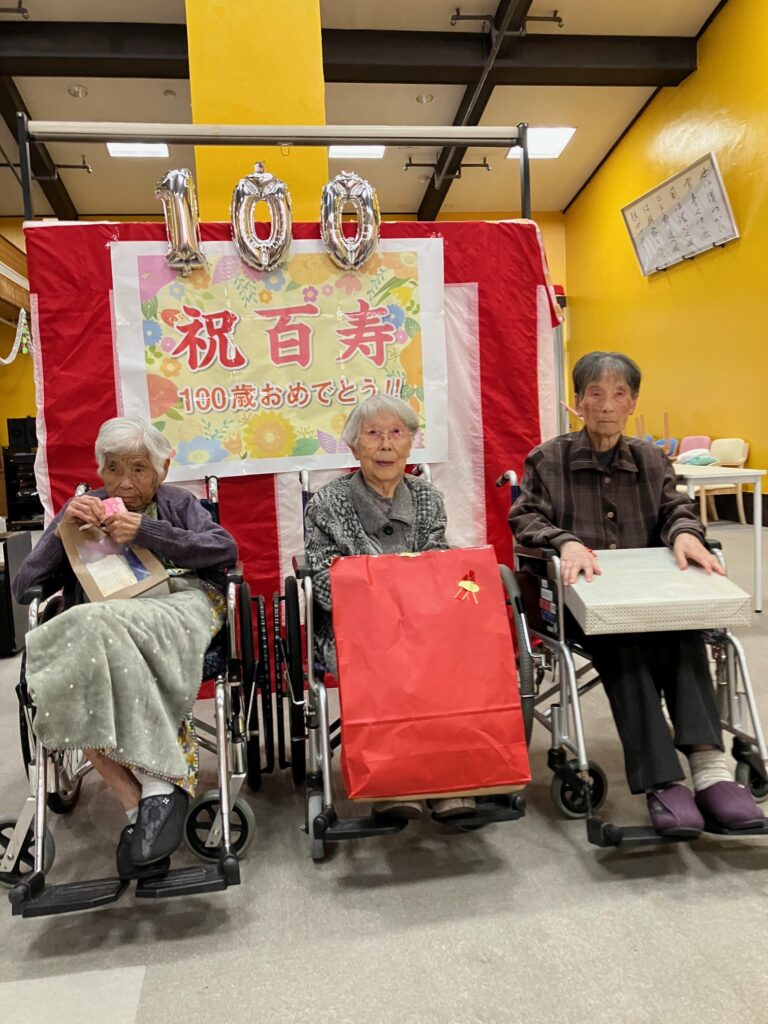 大正14年10月〜大正15年2月生まれで、100歳を迎えられた3名の皆様、本当におめでとうございます。左側から安永キク様、永田吉子樣、岩渕三重子様です。長年にわたり歩んでこられた人生に、心より敬意とお祝いを申し上げます。穏やかで優しい笑顔、そして日々の何気ないお言葉が、私たち職員や他のご入所者様にとって大きな励みとなっております。