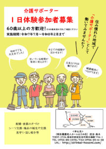 HOME トピックス お知らせ 介護サポーター 1日体験参加者募集 kaigo-support-0707-0802kaigo-support-0707-08022025年7月25日 previous介護サポーター 1日体験参加者募集