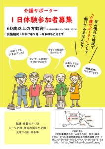 HOME トピックス お知らせ 介護サポーター 1日体験参加者募集 kaigo-support-0707-0802kaigo-support-0707-08022025年7月25日 previous介護サポーター 1日体験参加者募集